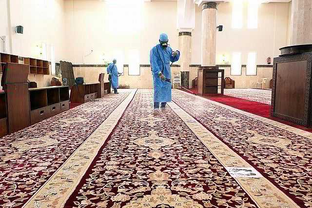 يأتي ذلك ضمن الإجراءات الاحترازية للحد من انتشار فيروس كورونا المستجد استعدادا لعودة المصلين فجر اليوم الأحد.