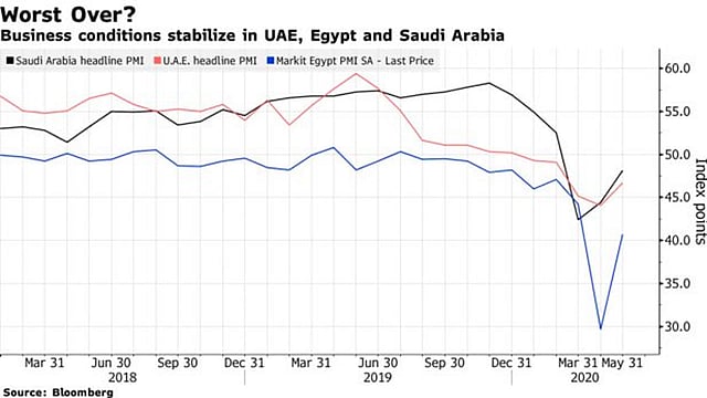 وفي الإمارات، ارتفع المؤشر ليبلغ 46.7 في مايو، مقارنة بـ44.1 في أبريل، وفي مصر ارتفع المؤشر إلى 40.1 من مستواه الأدنى الذي سجله في أبريل عند 29.7.