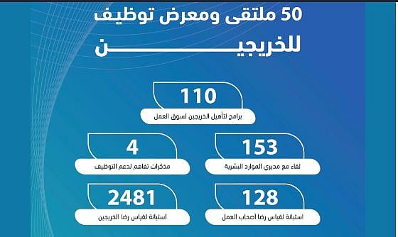 نظمت المؤسسة العامة للتدريب التقني والمهني 50 ملتقى ومعرضًا لتوظيف خريجي وخريجات الكليات التقنية والمعاهد في مختلف مناطق المملكة خلال شهر يناير الماضي، وذلك بالشراكة مع قطاع الأعمال.