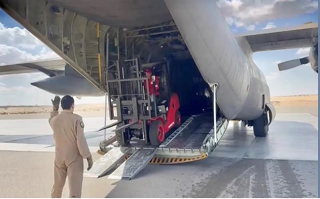 وتحمل الطائرتان على متنهما سيارتي نقل ورافعتين شوكيتين تم تسليمها للهلال الأحمر المصري للإسهام في تسهيل عملية تحميل ونقل المساعدات الإغاثية التي تصل إلى مطار العريش والمخصصة للشعب الفلسطيني الشقيق في قطاع غزة.