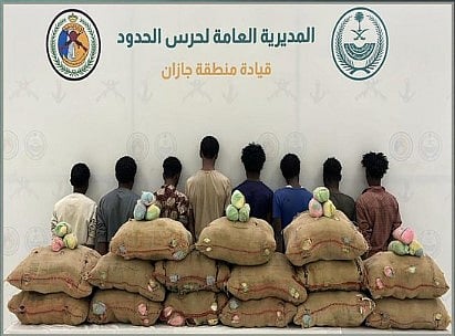 قبضت الدوريات البرية لحرس الحدود في قطاع الدائر بمنطقة جازان على 8 مخالفين لنظام أمن الحدود من الجنسية الإثيوبية، لتهريبهم (300) كيلوجراما من نبات القات المخدر.