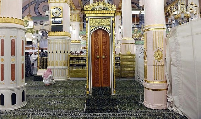 ما لا يعرفه كثيرون من زوار المسجد النبوي، هو مكان وقوع منبر النبي محمد عليه الصلاة والسلام، حيث يقبع في الجزء الغربي من الروضة الشريفة، وسطرت عليه عبارة « لا إله إلا الله محمد رسول الله» بالمدخل، وتضم مقدمة المنبر درجتين مكسوة بالسجاد، ويغلقها باب مصنوع من الخشب وله مقابض، وتزين المنبر بسلم يصعد منه الإمام أثناء خطبته، ومحاط بسياج معدني مذهب، يجذب أنظار جميع قاصديه بالمسجد النبوي.