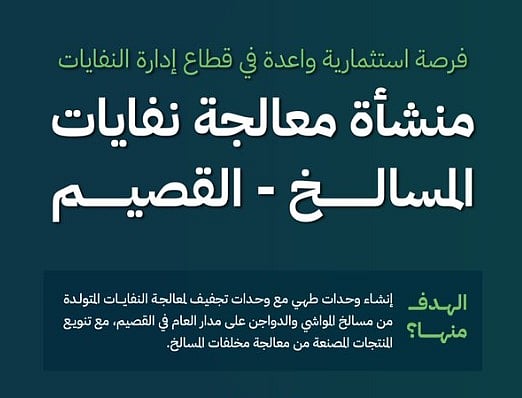 أعلن المركز الوطني لإدارة النفايات (موان) عن طرح فرصة استثمارية نوعية في مشروع منشأة معالجة نفايات المسالخ بمنطقة القصيم.