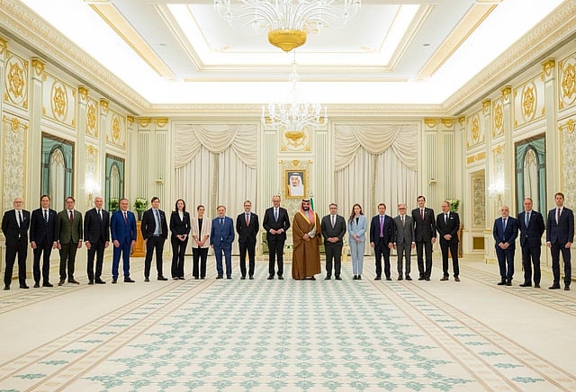 جمعت صورة تذكارية صاحب السمو الملكي الأمير محمد بن سلمان بن عبدالعزيز آل سعود ولي العهد رئيس مجلس الوزراء، ودولة المستشار الاتحادي لجمهورية ألمانيا الاتحادية فريدريش ميرتس، مع وفدٍ من رجال الأعمال المصاحب لزيارته للمملكة.