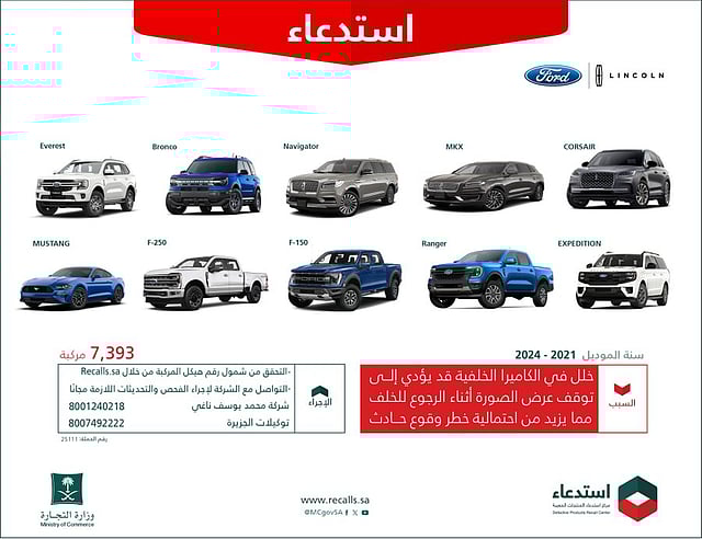 أعلنت وزارة التجارة عن استدعاء (7,393) مركبة من طرازي «فورد» و«لينكون» من عدة موديلات بين عامي 2021 و2024، بسبب خلل في الكاميرا الخلفية قد يؤدي إلى توقف عرض الصورة أثناء الرجوع للخلف، مما يزيد من احتمالية خطر وقوع حادث.