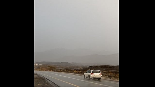 ويظهر المقطع هطول أمطار على أحد الطرق السريعة بالمحافظة، مصحوبة برياح نشطة.
