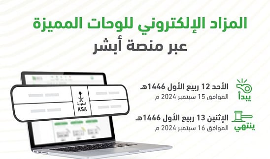 وذكرت الإدارة، عبر منصة (إكس)، أن طرح المزاد سيكون عبر منصة أبشر التي تمكّن الراغبين في شراء اللوحات المميزة من المشاركة في المزاد إلكترونياً.