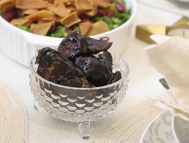 وفي رمضان، تبرز التمور على موائد الإفطار لتحليل إفطار الصائمين, ويكتنز الأهالي تمور حلوة الجوف عقب موسم إنتاجها، ويكون ذلك عبر عملية الكنز التي تتم بعد طرح النخيل إنتاجها من التمور لتبدأ رحلة إنتاج حلوة الجوف بمراحل التنظيف، وإزالة النوى وتنشيف التمور، ثم كنزها في عبوات كبيرة تزن أكبرها قرابة 15 كجم وعبوات صغيرة تستخدم للاستهلاك اليومي من التمور، لتحظى سفرة رمضان بحلوة الجوف التي تمتاز بالحبة الكبيرة والدبس المتبلور فيها الذي يسمى محليًا "المجرش", كما يهتم الأهالي بتقديم حلوة الجوف على مائدة الإفطار، فيما اعتاد العديد من المزارعين على تقديم كميات من إنتاجهم كهدايا للأهل والجيران.