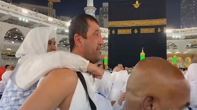 في مشهد مؤثر حمل معتمر أوزباكستاني والدته على ظهره أثناء الطواف خلال مناسك العمرة في الحرم المكي.