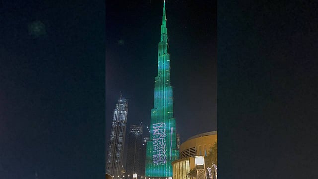 أضاء برج خليفة، اليوم الثلاثاء، بالعلم السعودي، احتفالًا باليوم الوطني الـ90 للمملكة.