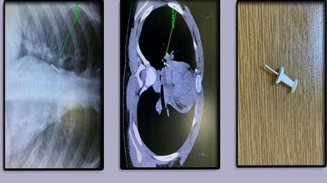 وأوضحت صحة الجوف، عبر تويتر، أن الطفلة وصلت إلى قسم الطوارئ بالمستشفى، وكانت، عن طريق الخطأ،خج قد استنشقت دبوسًا ليستقر في القصبة الهوائية اليمنى داخل رئة الطفلة.