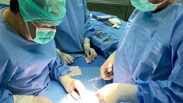 وبعد إجراء الإسعافات الأولية وعمل الفحوصات اللازمة، قرر الفريق المعالج من الأطباء والفنيين بالمستشفى وعلى رأسهم الأخصائي بسام يونس حاجته إلى إجراء جراحة عاجلة لتوصيل الوتر الرئيسي للإصبع ومعالجة الجروح المتهتكة، والتي تكللت بالنجاح ولله الحمد.