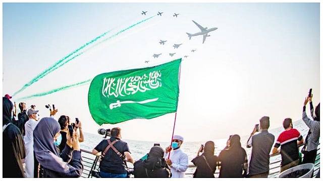 تخطت الاحتفالات باليوم الوطني الـ92، حدود المملكة، لتسري الفرحة في جميع أنحاء المعمورة، وتزينت السموات باللون الأخضر، ورسمت البهجة على وجوه أناس من مختلف الجنسيات.