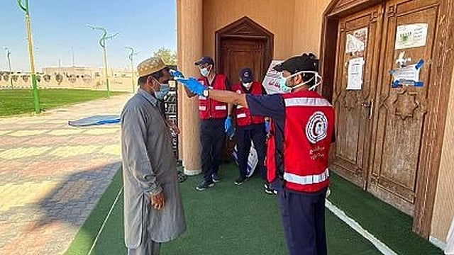 أقام متطوعو فرع هيئة الهلال الأحمر بمنطقة الجوف، اليوم الجمعة، نقاط فرز في عدد من جوامع المنطقة أثناء دخول المصلين لصلاة الجمعة، وذلك ضمن الإجراءات الاحترازية للحد من انتشار فيروس كورونا المستجد.