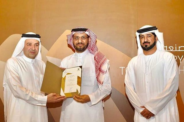 كرم ناصر آل رحمة مدير جائزة محمد بن راشد للإبداع الرياضي، الإعلامي علي القرني؛ وذلك خلال حفل توزيع الجوائز الذي أقيم مؤخرًا في دبي.