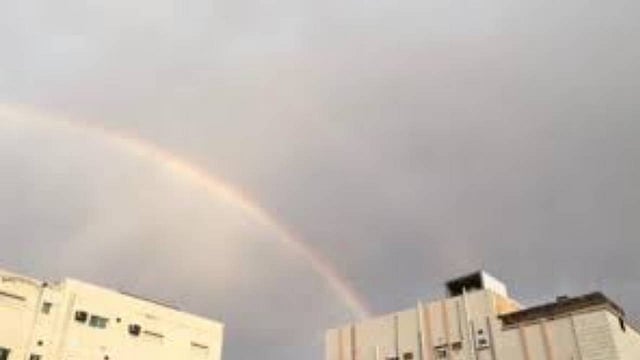رسم «قوس قزح» الذي غطى السماء مع هطول الأمطار اليوم، لوحة جمالية في سماء مكة المكرمة.
