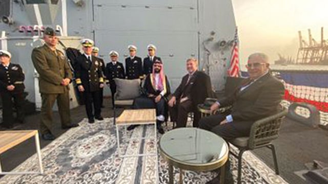 وفيما تم على متن طراد حربي في قناة السويس منذ 75 عامًا، فقد التقط سفير خادم الحرمين الشريفين في البحرين، الأمير سلطان بن أحمد بن عبدالعزيز، صورة مع حفيد الرئيس روزفلت على متن المدمرة الأمريكية «كوينسي» في ميناء جدة الإسلامي، بمناسبة ذكرى اللقاء التاريخي الذي كان الانطلاقة القوية للعلاقات السعودية الأمريكية، القائمة على الاحترام المتبادل.