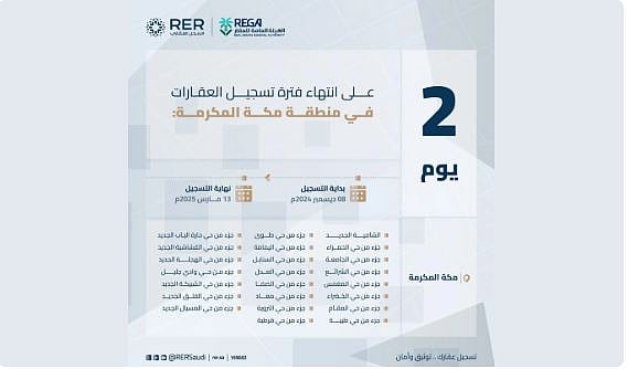 ودعت الهيئة ملاك العقارات الواقعة ضمن نطاق الأحياء التالية: (حي الشامية الجديد، وجزء من حي الشبيكة الجديد، وجزء من حي الفلق الجديد، وجزء من حي حارة الباب الجديد، وجزء من حي القشاشية الجديد، وجزء من حي المسيال الجديد، وجزء من حي الهجلة الجديد، وجزء من حي طوى، وجزء من حي طيبة، وجزء من حي الحمراء، وجزء من حي اليمامة، وجزء من حي معاد، وجزء من حي الجامعة، وجزء من حي السنابل، وجزء من حي التروية، وجزء من حي الشرائع، وجزء من حي المقام، وجزء من حي وادي جليل، وجزء من حي الصفا، وجزء من حي المغمس، وأجزاء من حي العدل، وأجزاء من حي قرطبة، وأجزاء من حي الخضراء) إلى سرعة المبادرة بتسجيل عقاراتهم من خلال منصة السجل العقاري www.rer.sa قبل انتهاء مدة التسجيل للاستفادة من خدمات تنفيذ التصرفات العقارية وتوثيق جميع التغييرات التي تطرأ على العقار.