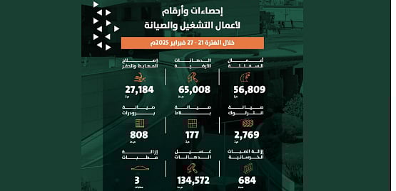 واصلت أمانة منطقة الرياض تنفيذ أعمال التشغيل والصيانة في مختلف أرجاء المدينة، إذ شملت جهودها خلال الفترة من 21 حتى 27 من شهر فبراير معالجة 27.184 مترًا مربعًا من المهابط والحفر، إضافة إلى صيانة 808 برودرات، وإزالة 3 مطبات؛ مما يسهم في تعزيز جودة الطرق ورفع مستوى السلامة المرورية.