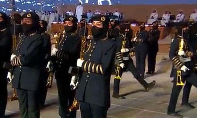 عرضت قناة الإخبارية، مقطع فيديو لمجندات سعوديات، أثناء تقديم عرض عسكري في المحفل الوطني يوم التأسيس.