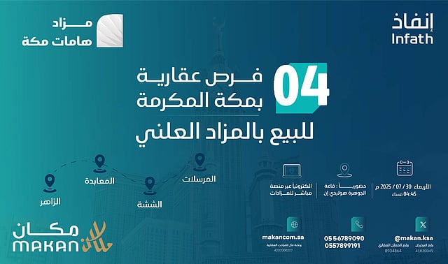 تعلن «مكان المستثمر»، وبإشراف مركز الإسناد والتصفية «إنفاذ» وبقرار من محكمة التنفيذ وبحكم من محكمة الأحوال الشخصية، عن إقامة مزاد «هامات مكة»، بشكل حضوري وإلكتروني وهجين، وذلك يوم 30/7/2025 حضوريًا الساعة 04:45 في قاعة الجوهرة فندق هوليدي إن بمدينة مكة المكرمة، وإلكترونيًا عبر منصة «مباشر» للمزادات.