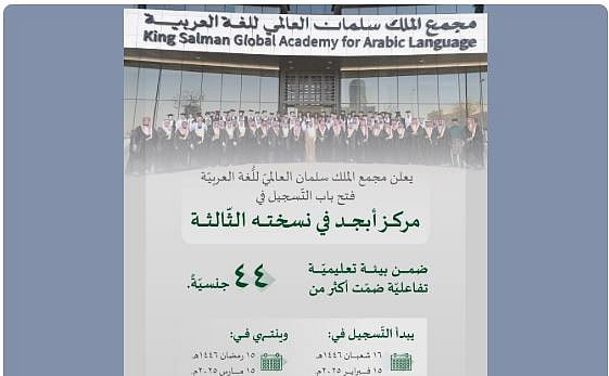 بدأ مجمع الملك سلمان العالميّ للُّغة العربيَّة، اليوم، استقبال طلبات التسجيل في النُّسخة الثالثة من مركز أبجد لتعليم اللُّغة العربيَّة للناطقين بغيرها، الهادف إلى تمكين المتعلمين من اكتساب مهارات اللُّغة العربيَّة، وفق منهجيَّة أكاديميَّة متقدمة، وتعزيز انتشارها عالميًّا، ويستمر التسجيل حتى 15 رمضان 1446هـ، الموافق 15 مارس 2025م، على أن تكون الدراسة حضوريَّة في الأول من شهر سبتمبر لعام 2025م.