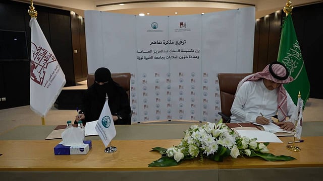 وقع المذكرة بمقر مكتبة الملك عبدالعزيز العامة بطريق خريص بالرياض، كل من المدير العام لمكتبة الملك عبدالعزيز العامة الدكتور بندر بن عبدالله المبارك ، ممثلا عن المكتبة، والدكتورة حنان بنت ناصر الصقية عميدة عمادة شؤون المكتبات بجامعة الأميرة نورة بنت عبدالرحمن ممثلة للجامعة.