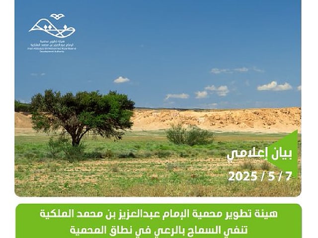شددت هيئة تطوير محمية الإمام عبدالعزيز بن محمد الملكية على منع الرعي في نطاق المحمية، داعيةً إلى استقاء المعلومات الصحيحة المتعلقة بالرعي من خلال موقعها الإلكتروني وقنوات التواصل الرسمية, وذلك إشارةً إلى المحتوى المرئي المتداول بشأن إتاحة الرعي والسماح به في المحمية، وتحديدًا في نطاق المحمية المجاور للطريق الذي يربط محافظة رماح ومركز شوية.