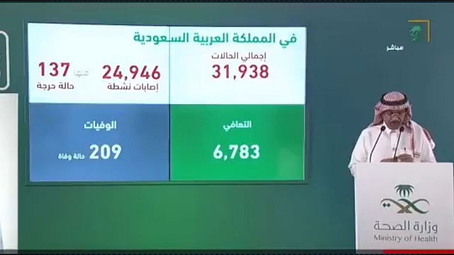 ووصل العدد الإجمالي للوفيات بالفيروس إلى 209، وفقًا للمعلومات الرسمية التي أوردها المتحدث باسم الوزارة الدكتور محمد العبد العالي، خلال المؤتمر الصحفي اليومي الخاص بآخر مستجدات فيروس كورونا في المملكة.