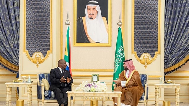 وأقيمت مراسم استقبال رسمية لرئيس جمهورية جنوب إفريقيا، وعقد سمو ولي العهد ورئيس جمهورية جنوب إفريقيا جلسة مباحثات رسمية، واستعرضا العلاقات الثنائية بين البلدين وأوجه التعاون في مختلف المجالات.