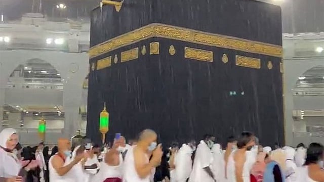 تداول رواد موقع التواصل الاجتماعي تويتر، مقطع فيديو، يوثّق طواف المعتمرين تحت الأمطار الغزيرة حول الكعبة في المسجد الحرام.