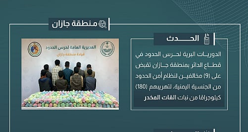 أعلنت الدوريات البرية لحرس الحدود في قطاع الدائر بمنطقة جازان، القبض على (9) مخالفين لنظام أمن الحدود من الجنسية اليمنية، لتهريبهم (180) كيلوجرامًا من نبات القات.