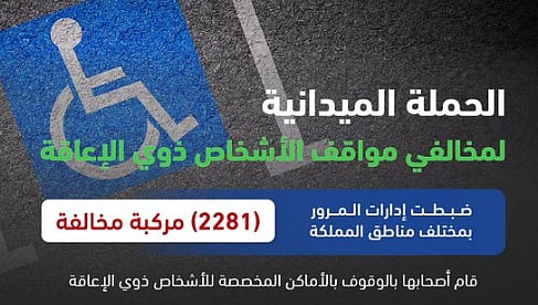 أعلنت الإدارة العامة للمرور، تنفيذ حملة ميدانية لضبط المركبات المتوقفة في الأماكن المخصصة للأشخاص ذوي الإعاقة.
