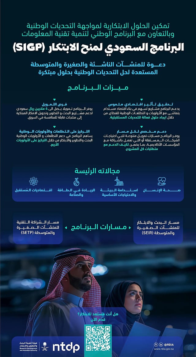 وسيسهم البرنامج في توفير تمويل مستدام يعزز من دور الشركات الصغيرة والمتوسطة في تحقيق مستهدفات البحث والابتكار بالمملكة، ويزيد من نسبة مشاركة القطاع الخاص في المنظومة البحثية والابتكارية، ويمكّنه من تقديم حلول تقنية مبتكرة ذات أثر ملموس في معالجة التحديات ودعم التنوع الاقتصادي وخلق الفرص الوظيفية.