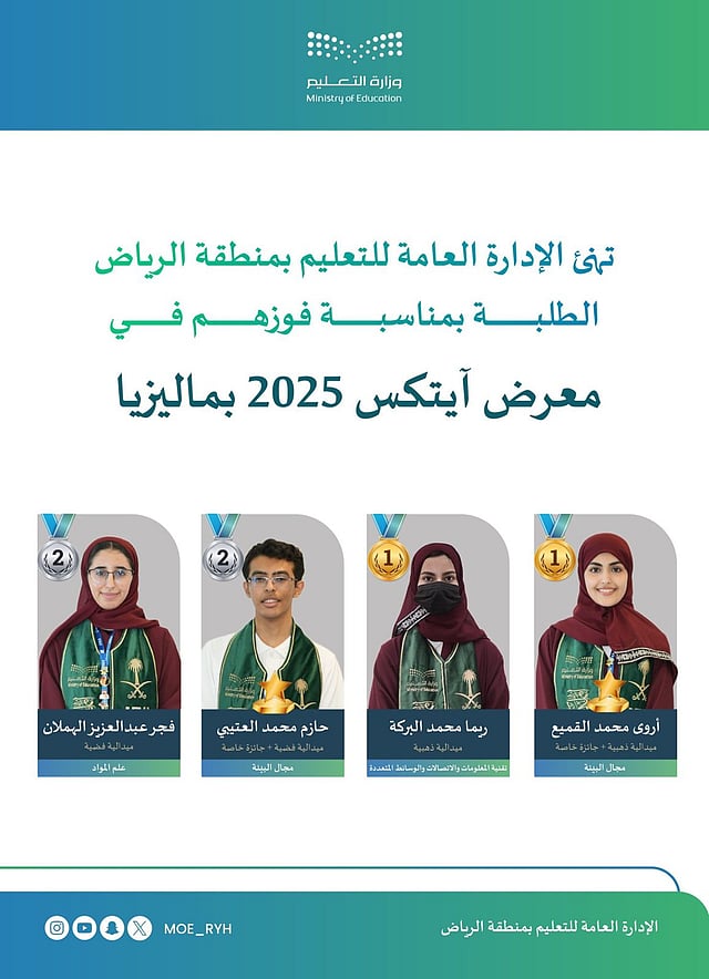 حقّق طلاب وطالبات الإدارة العامة للتعليم بمنطقة الرياض إنجازًا دوليًا جديدًا بحصدهم أربع ميداليات ذهبية وفضية ضمن مشاركتهم في المعرض الدولي للاختراعات والابتكارات والتقنية ITEX 2025، الذي أُقيم في ماليزيا، وذلك عبر تمثيلهم للوطن ضمن المنتخب السعودي.