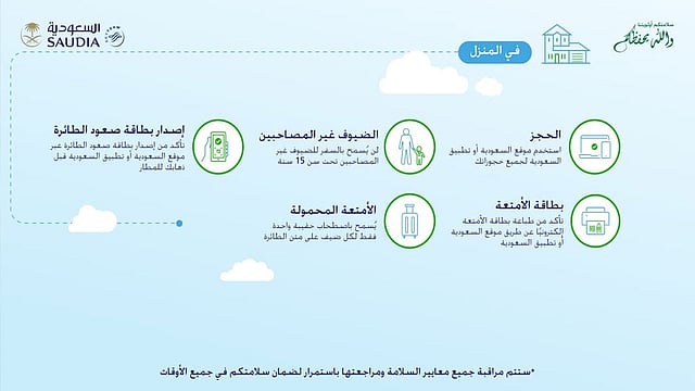 وتتضمن إجراءات الوقاية قبل الرحلة، تنفيذ جميع خطوات الحجز وإصدار التذكرة، وكذلك بطاقة صعود الطائرة وبطاقة الأمتعة عبر القنوات الإلكترونية للخطوط السعودية، سواء الموقع الرسمي لـ«السعودية» من خلال الحواسيب، أو عبر تطبيقها على الأجهزة الذكية.
