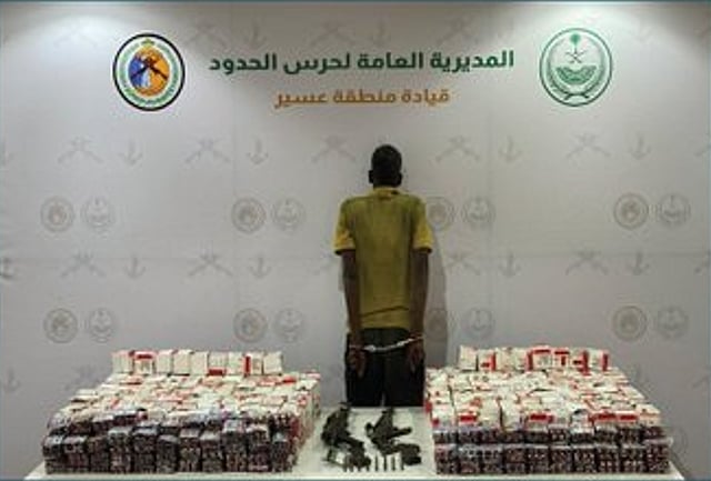 قبضت الدوريات البرية لحرس الحدود في قطاع الربوعة بمنطقة عسير على مخالف لنظام أمن الحدود من الجنسية الإثيوبية، لتهريبه (92,100) قرصٍ خاضعٍ لتنظيم التداول الطبي.