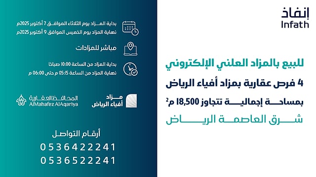 تعلن شركة المحافظ العقارية وبإشراف مركز الإسناد والتصفية «إنفاذ» بقرار من محكمة التنفيذ، وبحكم من محكمة الأحوال الشخصية، عن إقامة مزاد "أفياء الرياض" الإلكتروني على منصة مباشر للمزادات حيث يبدأ المزاد يوم الثلاثاء 07 أكتوبر الساعة 10 صباحاً وينتهي يوم الخميس 09 أكتوبر الساعة 6 مساءً وبحسب الموعد المحدد لكل عقار.