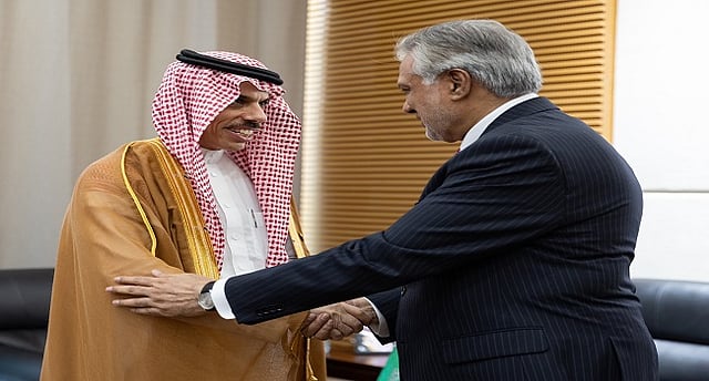 التقى الأمير فيصل بن فرحان بن عبدالله وزير الخارجية، اليوم السبت، وزير خارجية جمهورية باكستان الإسلامية إسحاق دار، على هامش الدورة الخامسة عشرة لمؤتمر القمة الإسلامي، المنعقدة في عاصمة جمهورية جامبيا بنجول.