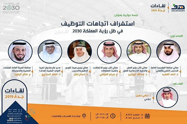 تشارك ست قيادات حكومية في جلسة حوارية بعنوان «استشراف اتجاهات التوظيف في ظل رؤية المملكة 2030»، ضمن ملتقى لقاءات جدة 2019م، الذي ينظمه صندوق تنمية الموارد البشرية «هدف»، في مركز جدة للمنتديات والفعاليات، خلال الفترة من 17 إلى 19 محرم 1441هـ (الموافق 16 إلى 18 سبتمبر) المقبل.