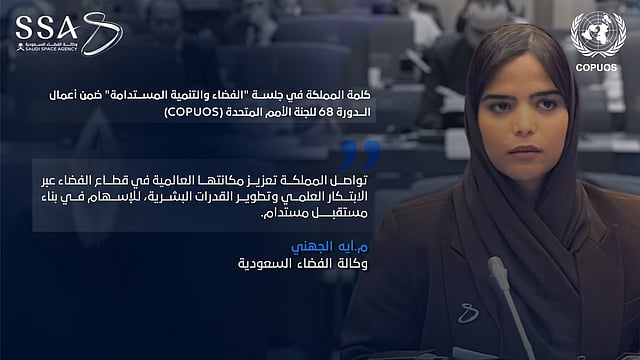 جاء ذلك في إطار مشاركة المملكة في الدورة الـ68 للجنة الأمم المتحدة لاستخدام الفضاء الخارجي في الأغراض السلمية (COPUOS) المنعقدة في فيينا،
