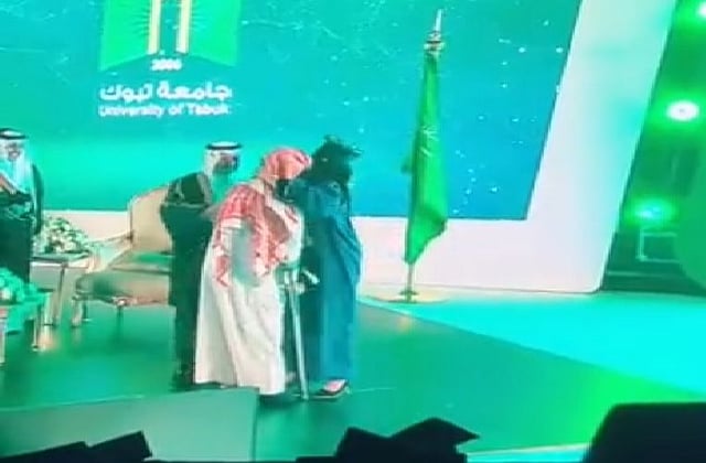 في مشهد مؤثر، أسرع مواطن إلى منصة التتويج لمعانقة ابنته احتفالا بتخرجها من كلية الطب والجراحة بجامعة تبوك بعد أن صعد مسرعًا للمنصة، متحديًا إعاقته.