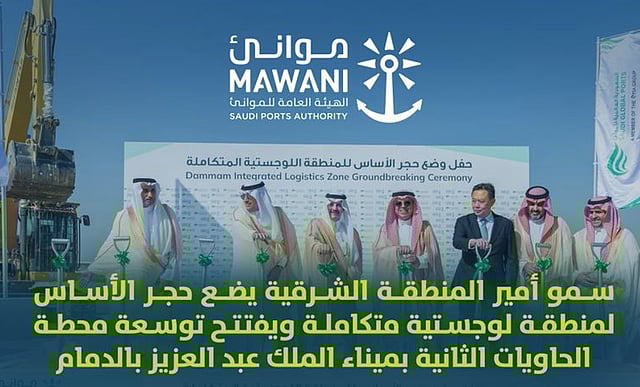 وضع الأمير سعود بن نايف بن عبدالعزيز أمير المنطقة الشرقية اليوم الأحد بحضور وزير النقل والخدمات اللوجستية رئيس مجلس إدارة الهيئة العامة للموانئ "موانئ" المهندس صالح بن ناصر الجاسر، حجر الأساس لمنطقة لوجستية متكاملة للشركة السعودية العالمية للموانئ (SGP)، كما افتتح أعمال التوسعة الجديدة في محطة الحاويات الثانية بالميناء باستثمارات من القطاع الخاص تتجاوز 2.8 مليار ريال، وذلك بحضور سعادة رئيس الهيئة العامة للموانئ المهندس سليمان بن خالد المزروع وعدد من المسؤولين والمختصين في القطاع البحري.