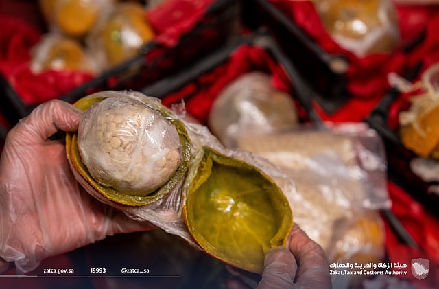 وأوضحت الهيئة أنه عند إجراء عملية الكشف والمعاينة لإحدى الشاحنات القادمة عبر المنفذ، عُثر على تلك الكمية من الحبوب مخبأة داخل إرسالية شمام، وذلك بإخفاء الحبوب في تجويف ثمار الشمام، وتغليفها.