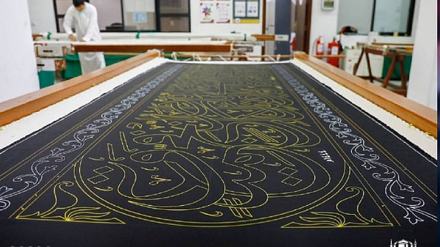 ويكمل «اللقماني»: «بعد أن تتم طباعة النسيج غير المنقوش منها كما تم التوضيح سابقًا بقسم الطباعة، فإن أهم ما يميز ثوب الكعبة المشرفة هو التطريز بالأسلاك الفضية والذهبية، وتتم هذه العملية بوضع الخيوط القطنية بكثافات مختلفة فوق الخطوط والزخارف وتعرف بالحشو، مع الملاحظة الفنية في كيفية أصول التطريز، المطبوعة على الأقمشة المشدودة على المنسج الذي يشكل (إطارًا) على مستوى سطح القماش، ثم يطرز فوقها بخيوط متراصة من القطن الأصفر لما سيطرز عليه بالأسلاك المذهبة، ومن القطن الأبيض لما سيطرز عليه بالأسلاك الفضية في اتجاهات متقابلة وبدقة ليتكون الهيكل الأساسي البارز للتصميم والحروف، ثم يغطى هذا التطريز بأسلاك من الفضة المطلية بالذهب ليتكون في النهاية تطريزٌ بارزٌ مذهبٌ يصل ارتفاعه فوق سطح القماش من ( 1-2.5 سم)».