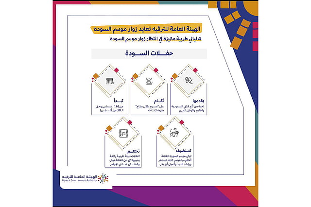 تُعايِد الهيئة العامة للترفيه زوَّار موسم السودة بعدد من الحفلات الفنية المتنوعة، التي تشهد حضورًا سعوديًّا وخليجيًا وعربيًّا، في خطوة تقدمها الهيئة ضمن مشاركاتها المتنوعة في جميع مواسم السعودية.