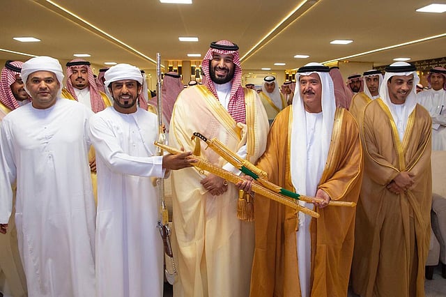 ولدى وصول ولي العهد إلى ميدان الهجن، يرافقه الأمير تركي بن محمد بن فهد بن عبدالعزيز، وزير الدولة عضو مجلس الوزراء، والأمير بدر بن سلطان بن عبدالعزيز، نائب أمير منطقة مكة المكرمة.