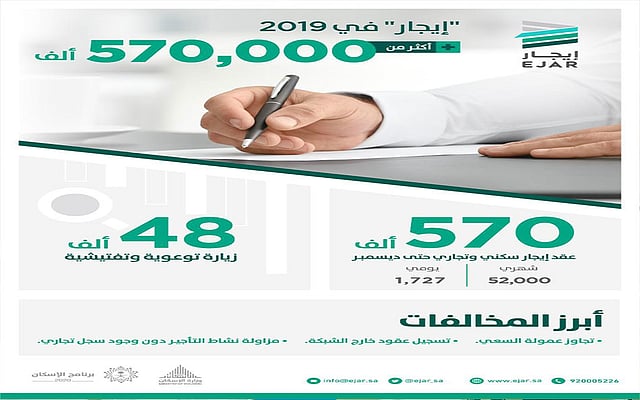 كشف برنامج «إيجار»، التابع لوزارة الإسكان عن توثيق نحو 570 ألف عقد إيجار سكني وتجاري في الشبكة الإلكترونية لخدمات الإيجار، فيما بلغ المعدل اليومي لتوثيق العقود في الشبكة خلال الفترة الماضية 1727 عقدًا إيجاريًّا ومعدل 52 ألف عقد شهري.