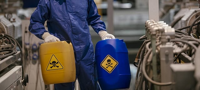المواد الكيميائية الخطرة: مواد كيميائية تتصف بسمّيتها أو قابليتها للانفجار، أو ذات خصائص أخرى يمكن أن ينجم عنها خطر على صحة الإنسان أو الحيوان أو البيئة.
