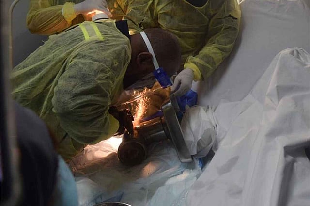 وتلقى مدني الرياض بلاغًا من طوارئ أحد المستشفيات يفيد بوجود سيدة تعاني من احتجاز يدها داخل فرامة لحوم، وعلى الفور انتقلت فرق الإنقاذ؛ لتعمل بواسطة التجهيزات الفنية الخاصة وتنجح في تحرير يدها.